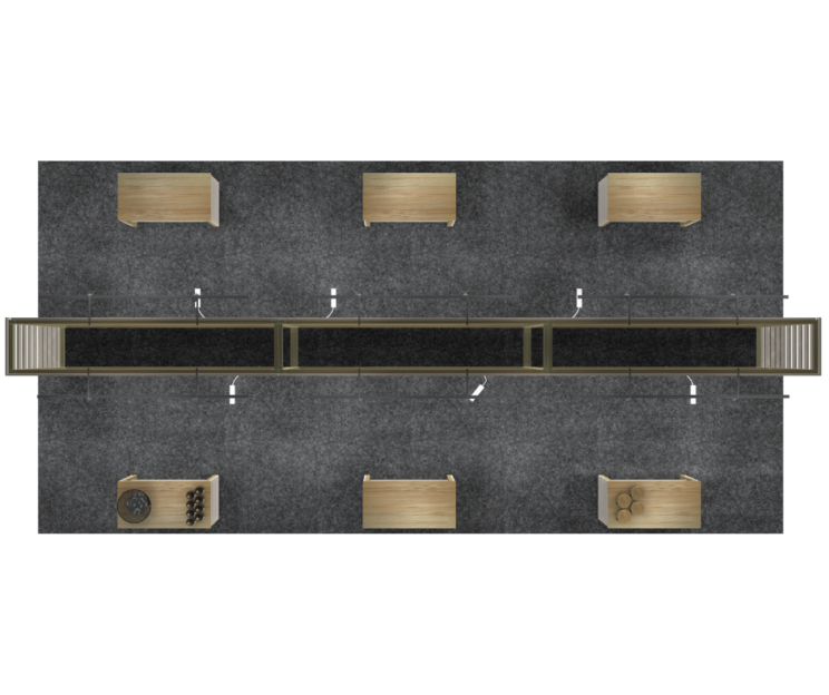 • Tiski 203 x 53 cm, korkeus 100 cm tiski (alumiiniprofiilirakenne mustilla sivulevyillä)