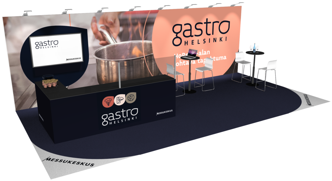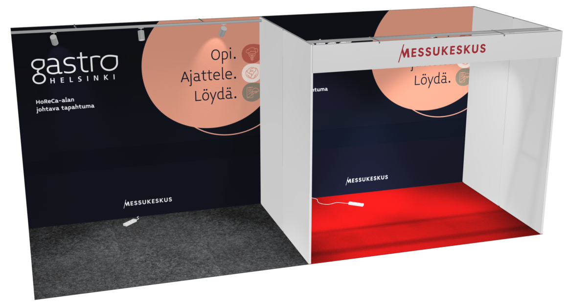Hyödynnä Gastron uudistuneet valmispaketit osastokokoihin 4m2, 6m2, 9m2, 12m2 & 24m2. SiSältää: näyttelytilan, valaistuksen, maton, pistorasian, osastorakenteet ja kangasbanderollin takaseinälle.
